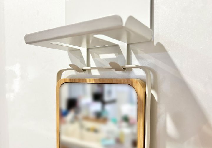こうすれば、壁掛けミラーとしてお出かけ前の身だしなみチェックに、外してスタンドミラーにすればメイクに使えます。