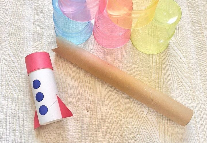 次に、子どもたちが夢中になる工作タイム。材料はトイレットペーパーの芯・ラップの芯・輪ゴムの3つだけで簡単にロケットが作れます。