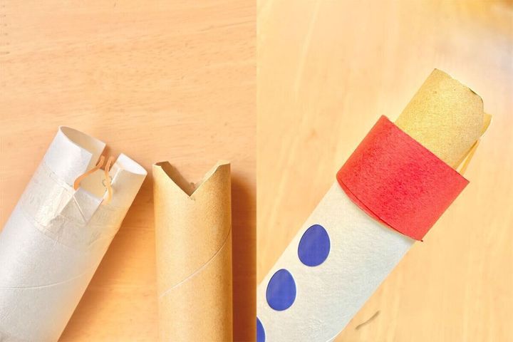 1.トイレットペーパーの芯に切り込みを入れて、輪ゴムを取り付けてテープで止めます。切り込みを入れた部分を折り返してテープで止めると輪ゴムが抜けにくくなります。