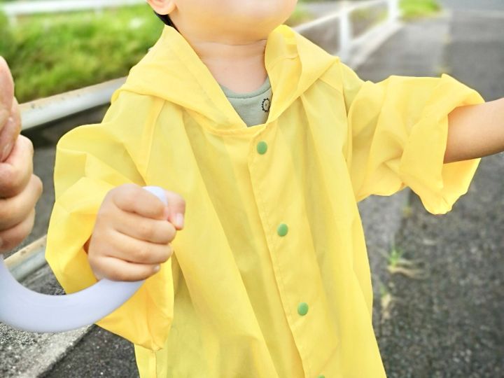 下の子はまだ傘を上手く持てません。レインコートでの登園は、わが子の通う園では少数派ですが、人やモノに傘をぶつける心配をしたり、上手に傘を持てずに朝から濡れるよりは、モヤっとせずに済んでいますよ。