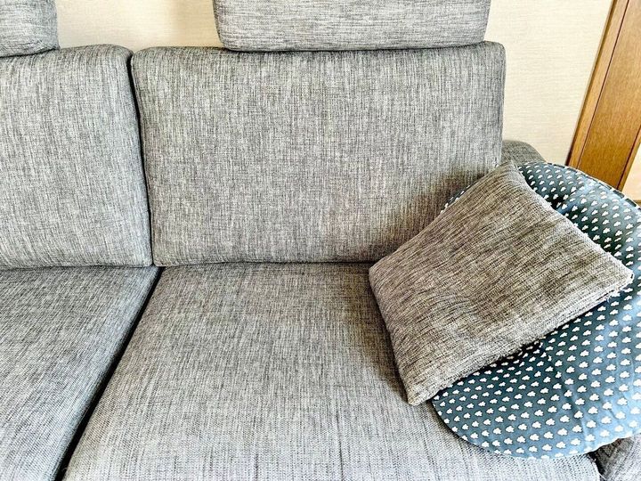 もう1つの習慣は、お出かけ前にソファのクッションをセットしておくことです。休日のお出かけ帰りって、高確率で子どもが寝ちゃうんですよね。