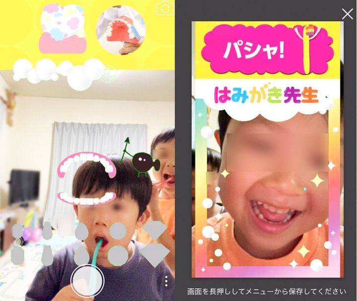 イマドキの技術を使った「AR動画」で、自分の顔をスマホの画面に映しながら、指示された順番にはみがきをしていくことで、バイ菌をやっつけて「ジェム」という名のキラキラした宝石をゲットしていく「はみがきゲーム」になっていました。