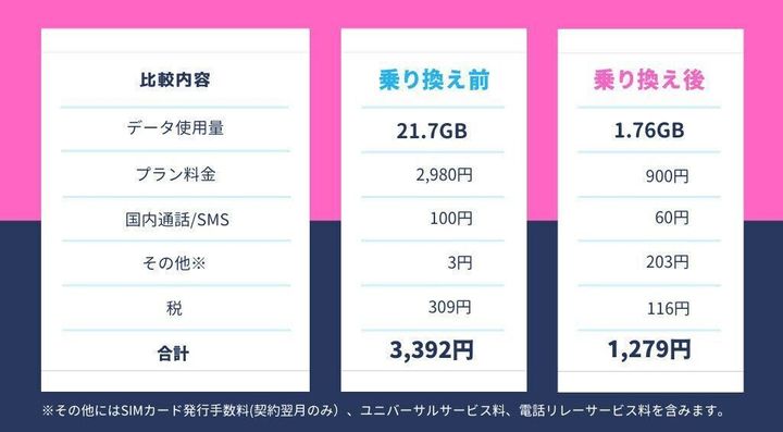 以前の格安SIM会社では、データ使用量が多い月では21.7GBも使っており、料金は3,391円。IIJmioに乗り換え後は、5ギガプランで1,279円に。料金を3分の1にまで抑えることができました。