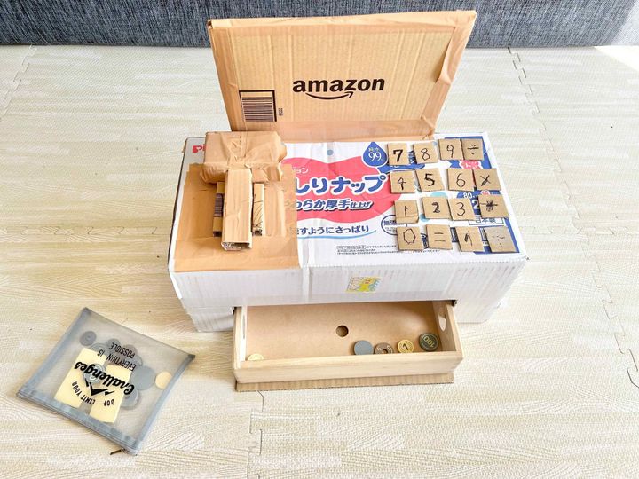まず、ダンボールでレジをつくって工作遊びします。工作は、手先も頭も使うので良い遊びです。