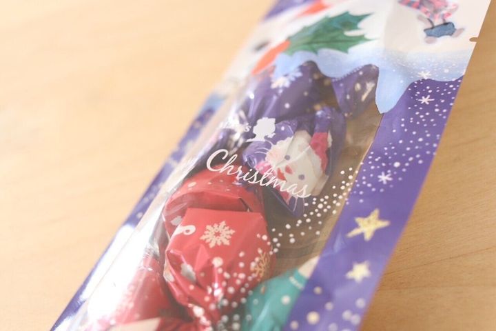 サンタ、ねこ、くまの3種類のデザインのパフ入りチョコレート。2層になっており、お味はそれぞれミルク、ホワイト、ストロベリー。カルディのお菓子よりも大きめなので、特別日として何個か入れてみました。ほんわか、かわいいイラストがなんとも心くすぐられます。