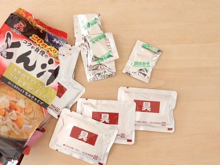生みそタイプで具材と別れています。全部で20食入り。具材の中身は大根、豚肉、人参、ごぼうなど、即席みそ汁の中では内容量が多いように感じました。こちら1月に購入して賞味期限が6月までだったので、約5か月ほど日持ちします。お味もおいしく、満足感があるのでおすすめです。