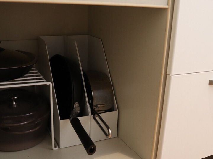わが家ではコンロ下の小鍋、フライパンをファイルボックスに収納しておりますが、使う度にガタガタとファイルボックスが前に出てきてしまっていたのです…。地味にイライラしますよね。そこでこの連結パーツを2か所に取り付けてみましょう!ファイルボックスがずれなくなりました。他にも文房具入れのケースに付けてみましたが、こちらもケースがずれませんでした。さらに強度を高めたい方は、下に魔法のテープなどで固定するといいかもしれません。