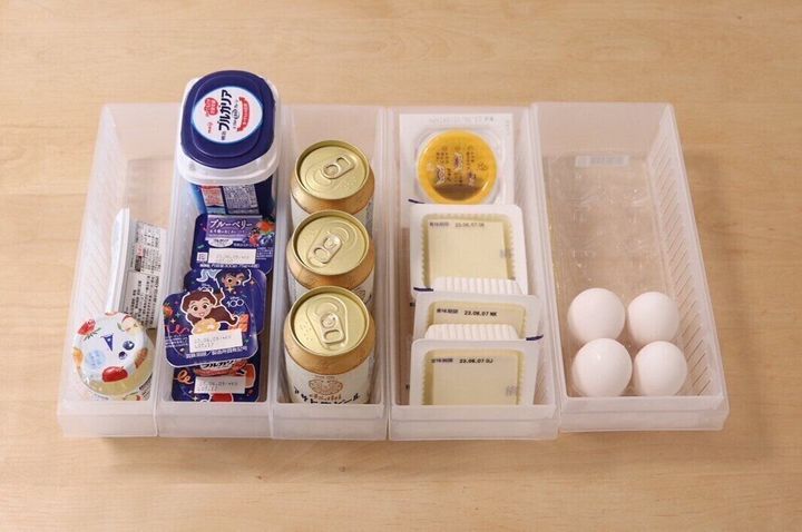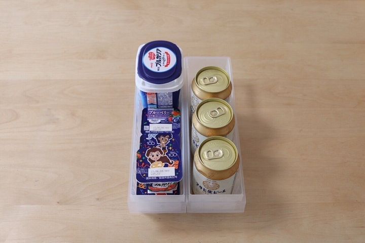 冷蔵庫内整理トレー中には、ヨーグルト(400g、4個パック)や缶ビールなどがぴったりでした。ドレッシング収納にも使えると思います。