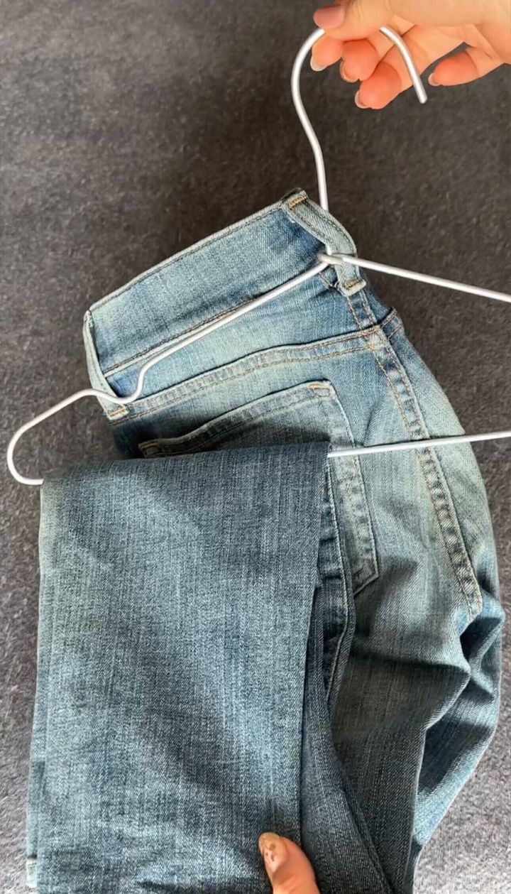 このようにすると、ベルトがないタイプのパンツでも綺麗にかけることができますよ!