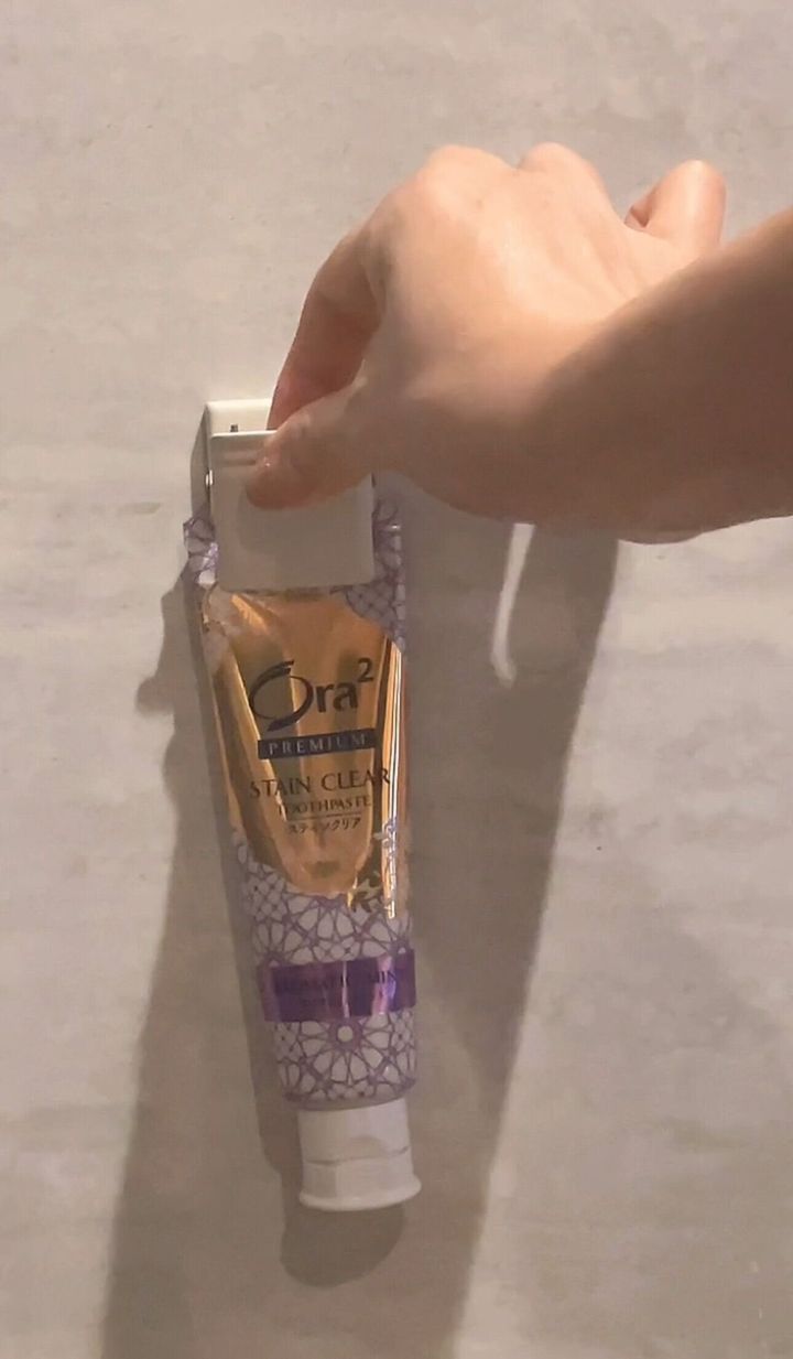 歯磨き粉にマグネットクリップを装着すると、浮かせて収納することが可能になります!
