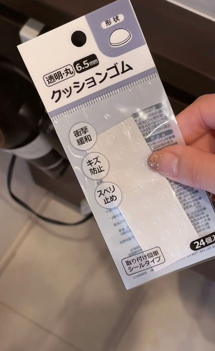 このアイテムは、シールタイプのクッション性のあるゴムです。こちらは衝撃を吸収してくれるという機能だけでなく、滑り止めや引き出しの落下防止にも使える優れもの!