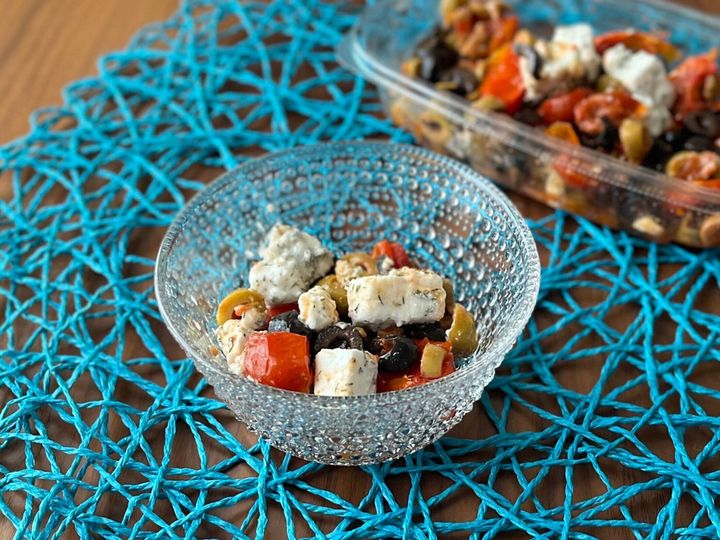 羊や山羊のミルクを原料とした「フェタチーズ」に、セミドライトマト、そしてスライスされたグリーンオリーブとブラックオリーブ。これらが白ワインビネガーベースの液でマリネされています。