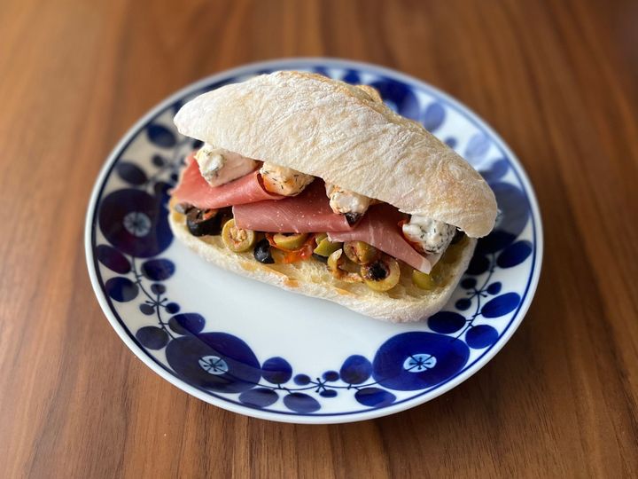 チャバタは気泡が多いパンなので、噛むたびに生地にしゅみたマリネ液がジュワ〜っと溢れ出します。そしてもちもちと噛むたび、小麦の旨味とオリーブやトマトの風味がお口いっぱいに広がり、後口はさっぱり。フェタチーズの食感や塩っ気で、食べ応えも十分です。