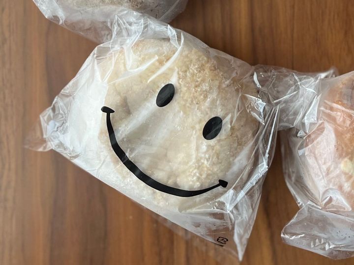 段ボールを開けた際に1番心躍ったニコちゃん柄の袋に入ったベーグル。「久喜ベーグル」と名付けられたクッキー生地の乗ったベーグルです。