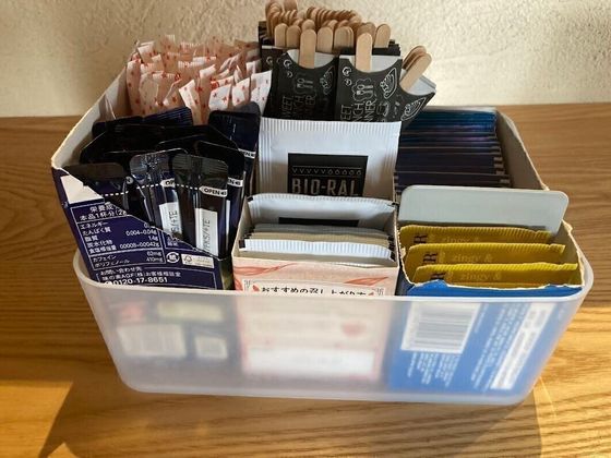 ダイソーの収納ボックスに、お茶、マドラー、シュガーなどをまとめています。