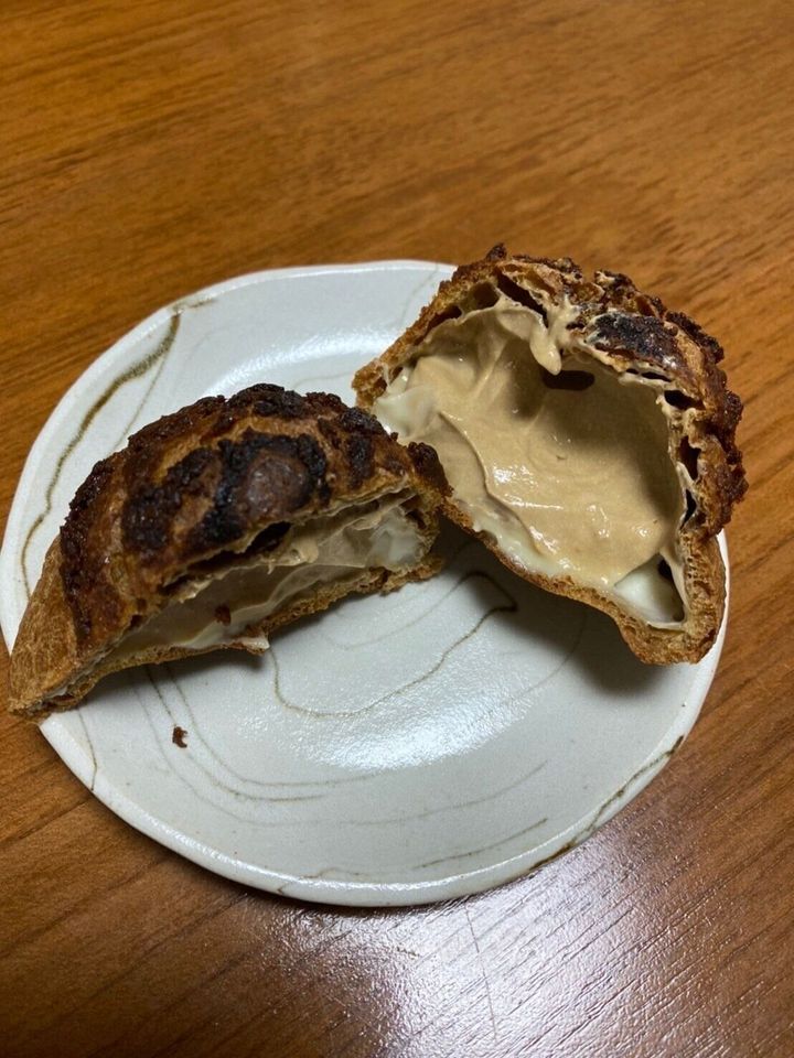 通常のシュークリームパフよりも、コーヒー生地の為黒く、焦げてるようにもみえます。