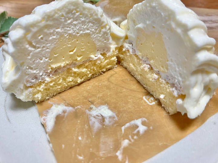 半分に割ってみると3種類のクリームとスポンジが見えました。クリームの色もそれぞれ異なっていて違う味が楽しめるようです。