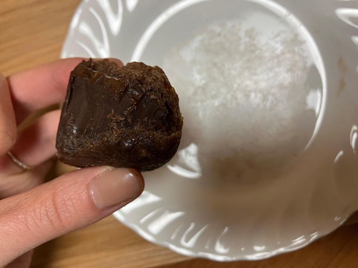 袋から取り出すと、丸い大きな生チョコのような見た目のボンボローニが出てきました。