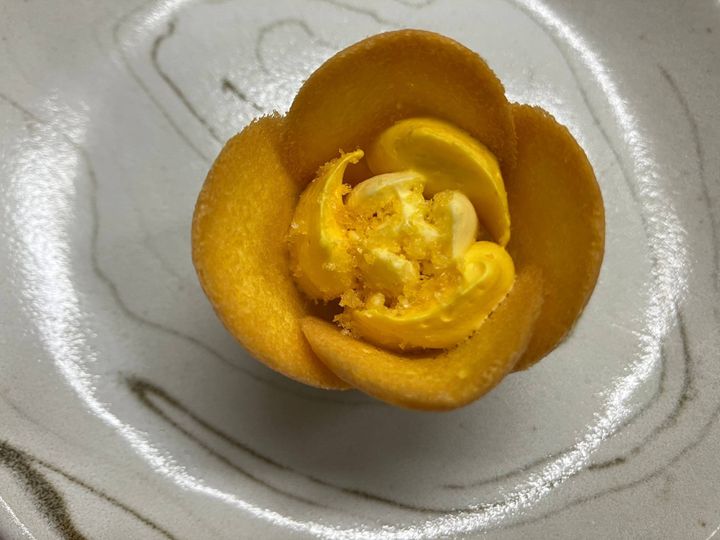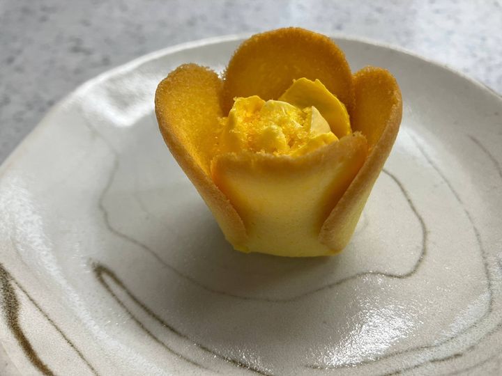 今回は、パッションマンゴーの味を紹介します。上から見ると本当のお花ように何層もの花びらが重なっているようになっています。真ん中にはフリーズドライマンゴーが散りばめられていて、細部までこだわりが感じられます。