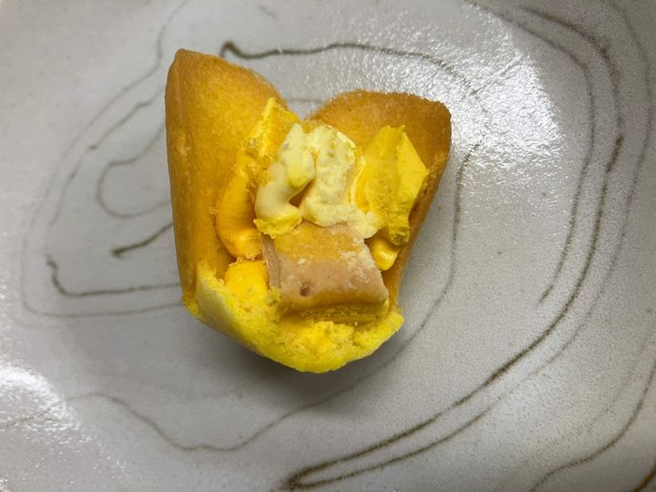 中はパッションフルーツショコラクリームとマンゴークリームと小さいパイが入っていて、マンゴーとパッションフルーツの味を存分に味わうことができます。ショコラクリームとなっていますが、一口食べるとマンゴーの爽やかな味が広がり、チョコのような感じとは違います。