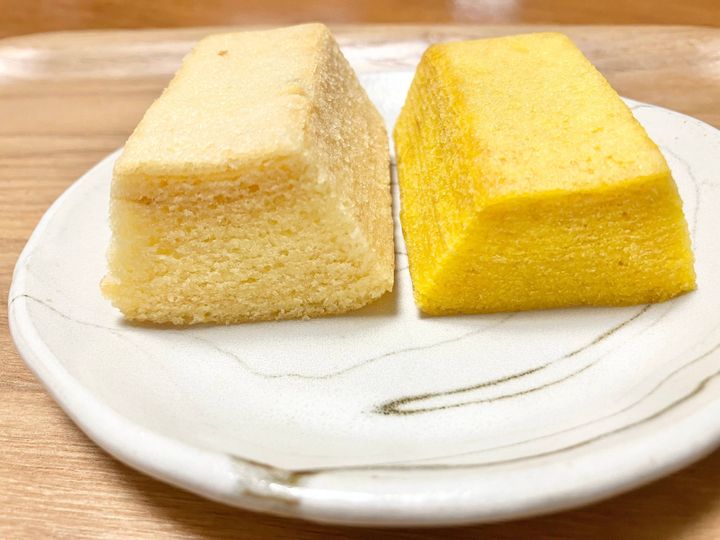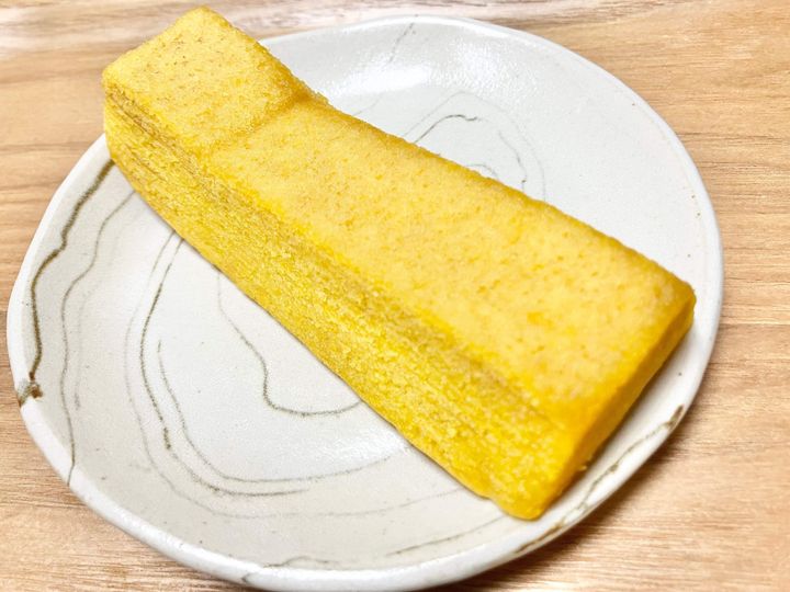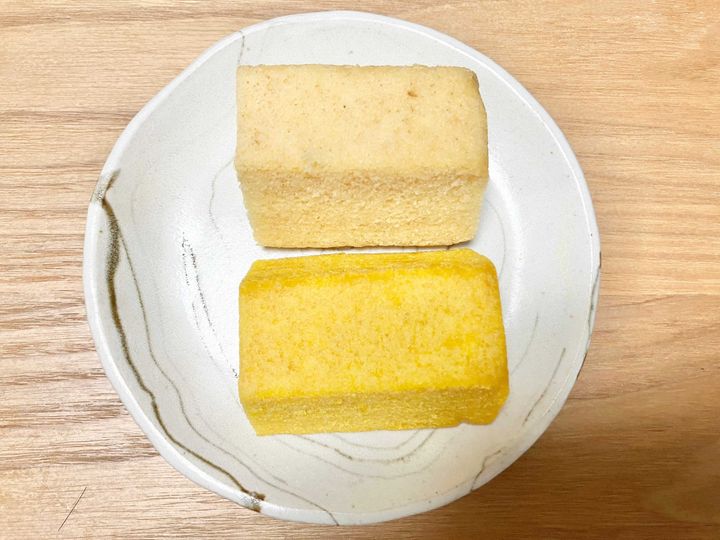 色は結構濃い黄色。マンゴーとかのケーキのように見えます。甘夏の香りはそんなにしませんでした。味は、甘夏というよりオレンジに近い味で、オレンジピールを思い出しました。オレンジピールチョコやパウンドケーキがあるので、そんな感じです。ほろ苦さと記載がありましたが、苦さはそこまで感じることはありませんでした。我が家の6歳の男の子は、バナナ味のほうがいいといっていたので、子ども向けの味ではないかもしれません。