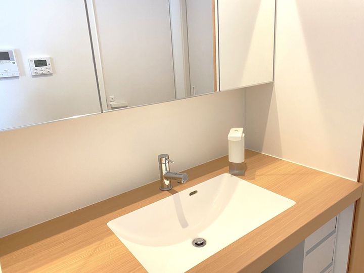 洗面台が木目カラーなので、白い布に貼って見てもらいましょう。