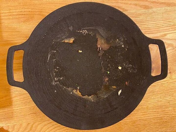 餃子を焼いた後の写真です。すぐに洗っても汚れは落ちますが、少しの間水を入れて置いておきます。