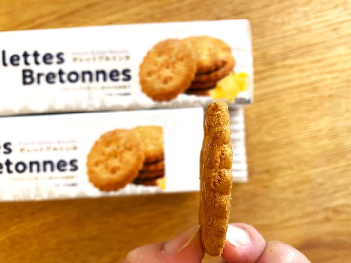 横から見ると6mm位でしょうか。ケーキ屋さんに売っているガレットブルトンヌはもっと厚みがあるものが多いですが、こちらは見た感じは普通のクッキーです。