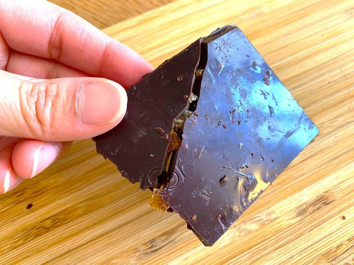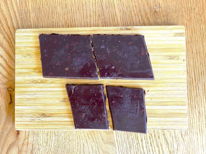 開封すると、ビターなチョコレートの香りがします。大きめに割ってある?チョコレートが4つ入っていました。(厚みは約6mm)カカオ72%なのでチョコレートの色も濃いですね。