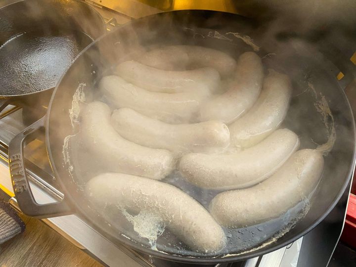 解凍後、袋を開けてみると繋がっていました!天然豚腸を使用していて、繋がっている部分を切って調理します。