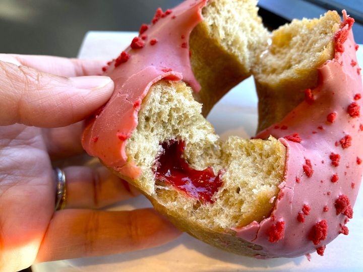 ここで気を取り直して、ストロベリードーナツ登場!表面には、甘酸っぱいストロベリーコーティングに、パラパラと散りばめられたストロベリートッピング。