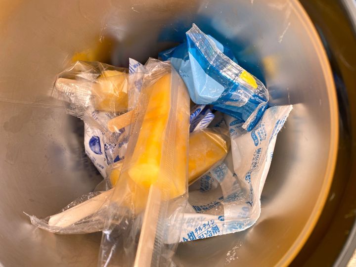 なんと、アイスは全く溶けていませんでした!保冷材は、ケーキなどを買ったときについてくる小さいものを幾つか入れただけ。これでこんなに溶けていないのは、凄いです。