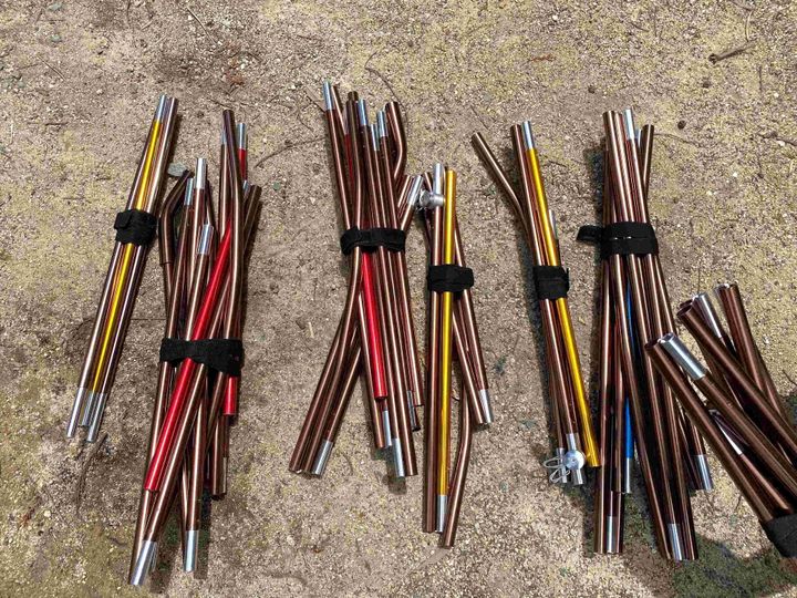 我が家では、テントとタープのポールを束ねるのに愛用しています。ゴムなので束ねる物の太さが違っても大丈夫!ぐるっと2週か3週巻きつけて、端についているマジックテープで止めるだけ。しっかりまとめることで、使いやすくテント設営時の時短にもなっています。(こちらの商品はサイズ違いで3本入りと4本入りがありますので、束ねたいものに合わせて使用しています。)