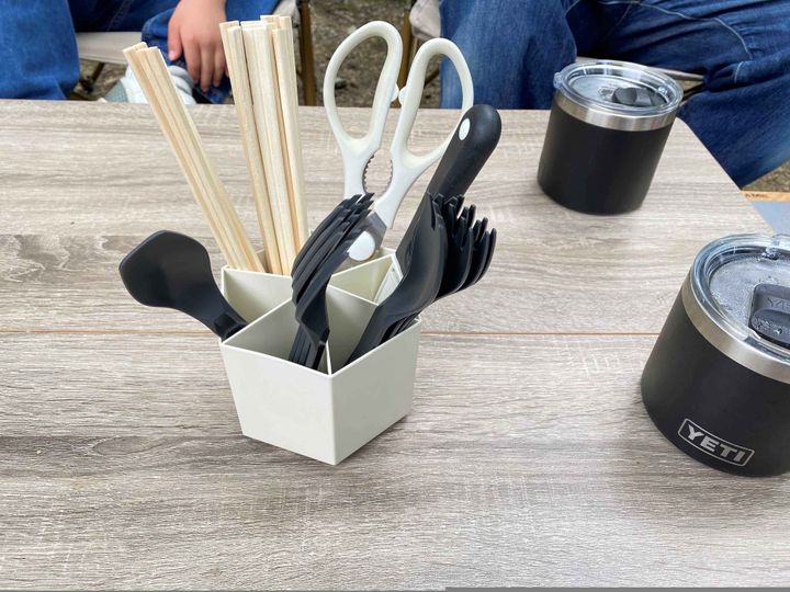 キャンプ中は、スッキリさせたいのですが、どうしてもごちゃごちゃしてしまいがち。調理中は特に、お箸、はさみ、包丁、スプーンと『あれ取って!はさみどこ行った?』などとバタバタしがち。