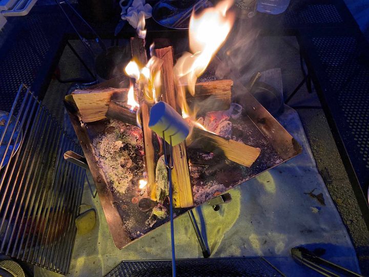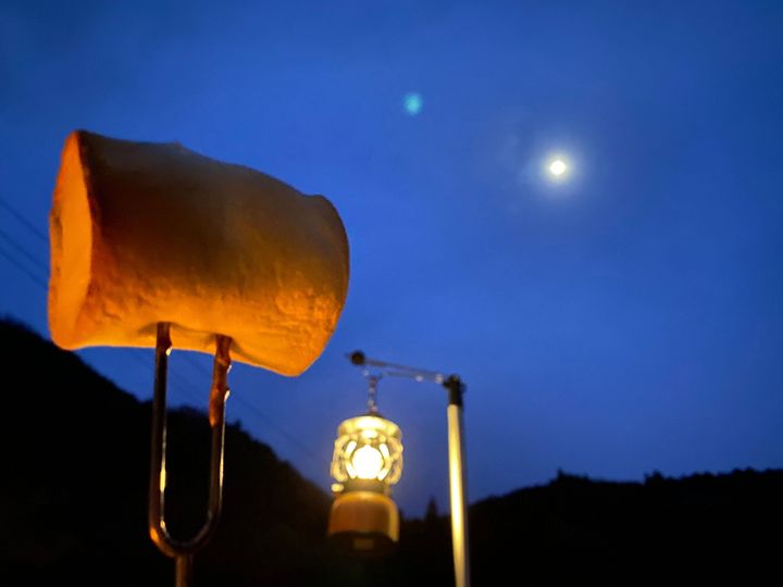 晩御飯が終わったら、子ども達が楽しみにしている焼きマシュマロタイムのスタートです。この串の良い所は伸びたり縮んだりするところ。焚き火台に近づきすぎると心配なので、マシュマロ串を長く伸ばして、火から距離を取りながらマシュマロを焼けるので安心です。使い終わったら縮めて短く収納できます。