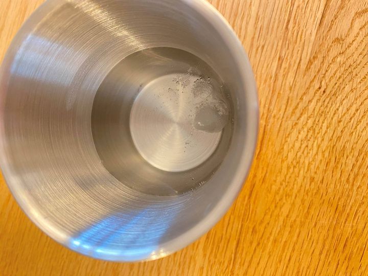 氷だけをカップのフチまで入れてお出かけし(室内)、5時間後の写真です。氷は、ほんの少しだけですが残っていました。溶けた水はまだまだ冷たかったので、通常よりは氷も溶けにくいように思います。