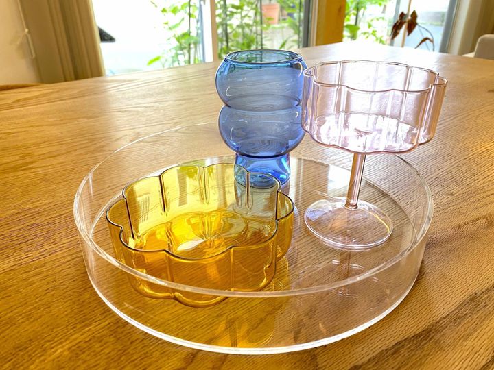 まるまるトレイはガラスではなくアクリル製です。もこもこグラスなどを乗せてお茶を楽しむのも良いですね。それ以外にも、キャンドル等と一緒にフラワーアレンジに使用したり、お気に入りのインテリア小物とディスプレイに使う事もできるので、色々と楽しめそうです。
