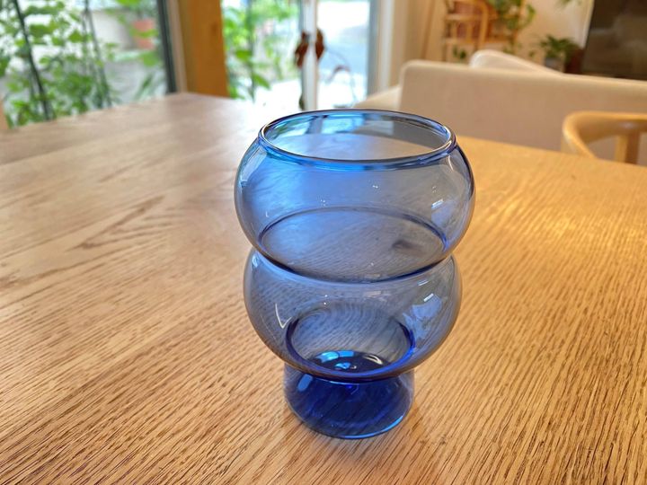 ぷっくり丸みのあるデザインがかわいいグラス。透明感のある綺麗なブルーも素敵です。ドリンクはもちろん、ポッキーや野菜スティックなど入れても。