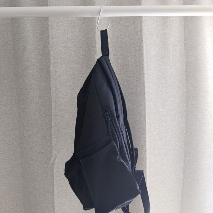 クローゼットのバーにS字フックでリュック吊るすと、幅をとられてしまいます。
