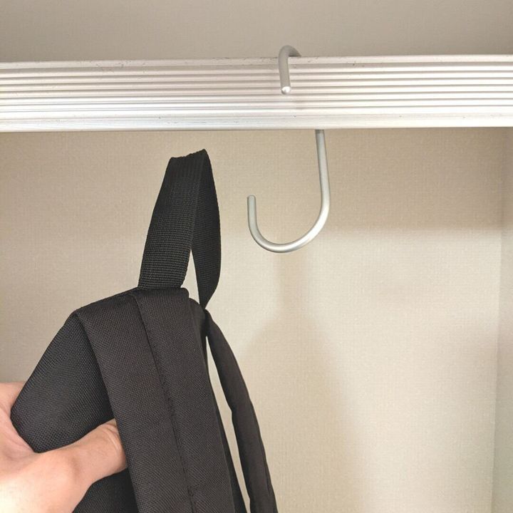 そんなときは今回ご紹介するねじれたS字フックを使うことで、リュックが横向きになり省スペースになりますよ。