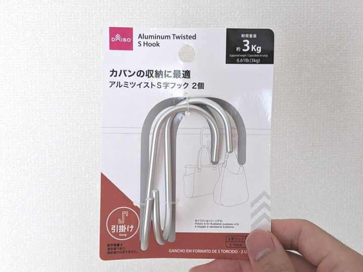 幅をとりがちなカバンの収納は「ツイストフック」がオススメ!ダイソーのアルミツイストS字フックで空間も見た目もスッキリ!