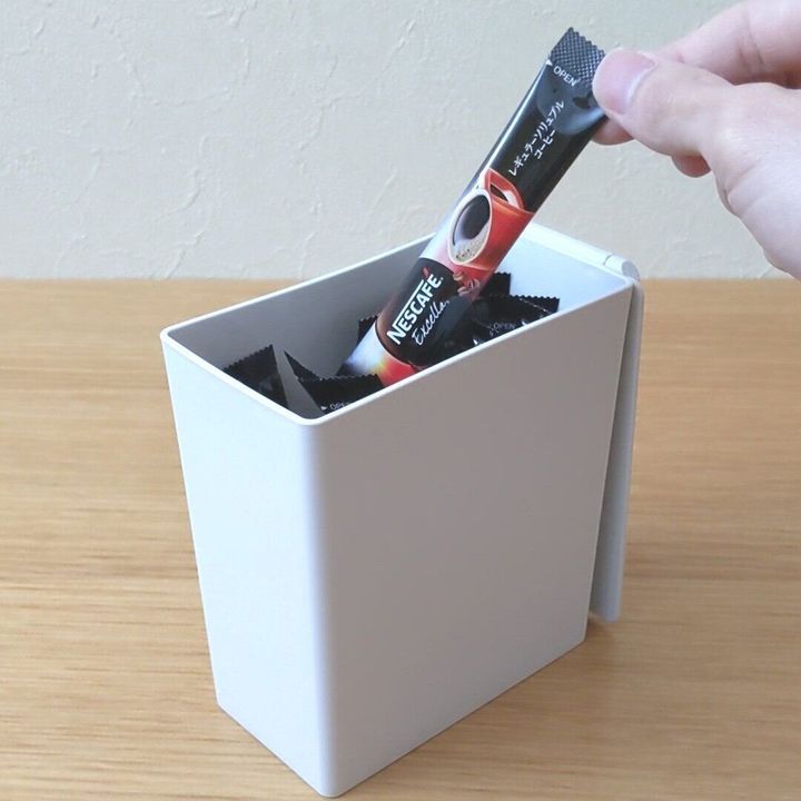 キッチンでスティックコーヒーや袋止めクリップを入れたり