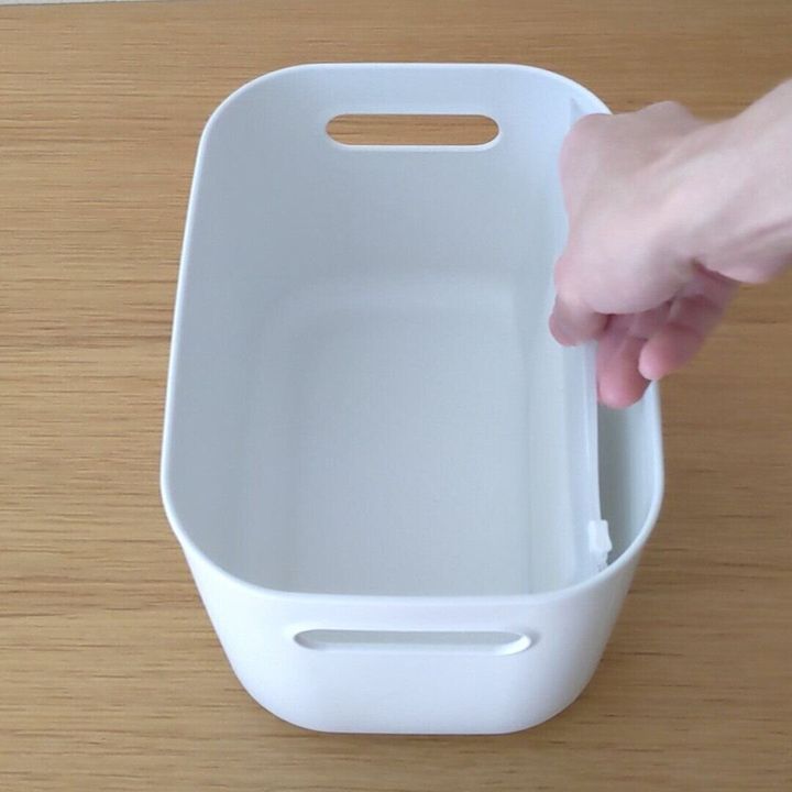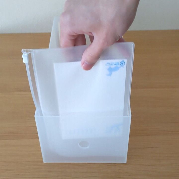 無印良品のやわらかポリエチレンケースのハーフサイズには、縦にも横にもピッタリおさまりますよ。