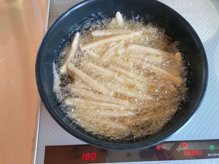 ⑤180℃の油で5〜10分揚げる。揚げ始め2分ほどは、粉が取れるので触らない。