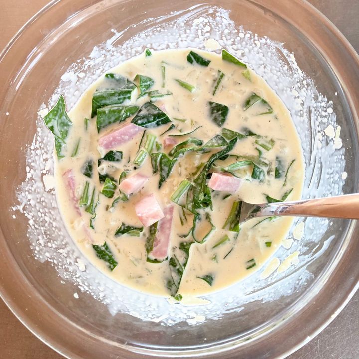 玉ねぎとほうれん草が混ざったら、ベーコン、Aを加えてよく混ぜ合わせる。