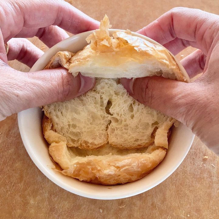 2、ココット1つにクロワッサン1個分を使い、パンを敷き詰める。指でパンをつぶすように全体を押し付け、底の角を特にしっかり押しておくと、焼き上がりの形がきれいに出ます。