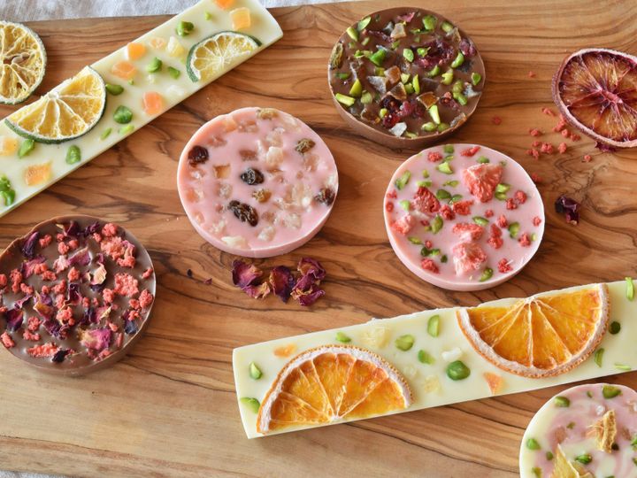 4.今回使用したトッピングは、ドライフルーツ、フリーズドライイチゴ、ピスタチオ、食用花です。ナッツやクッキー、マシュマロなどお好みでどうぞ。