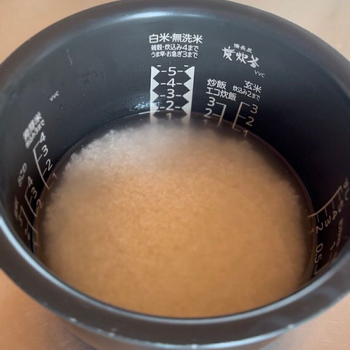 2.米を研ぎ、水気をきって炊飯器に入れる。