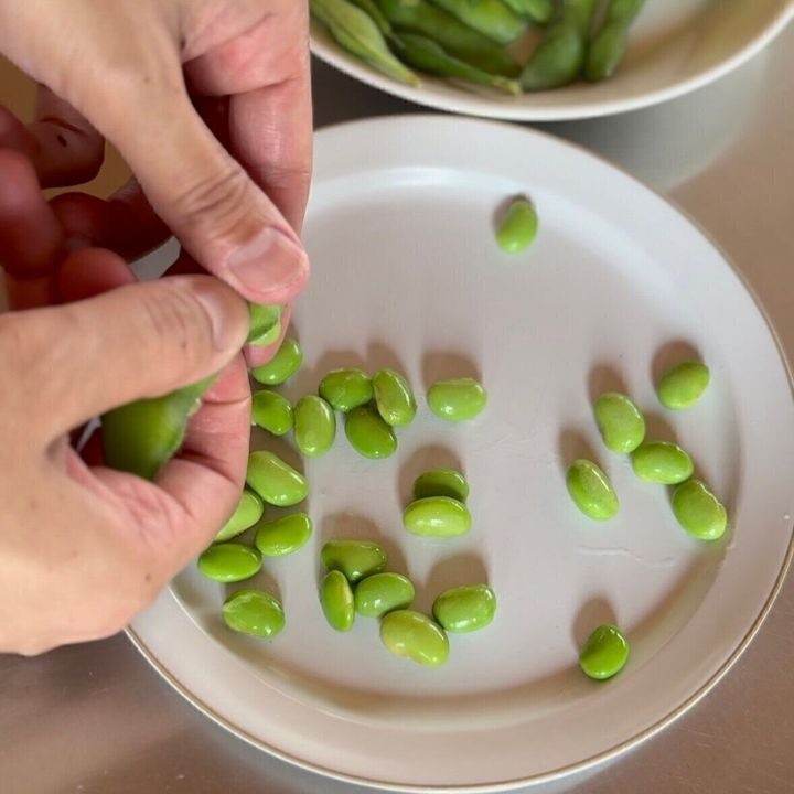1.枝豆は洗い、耐熱皿にのせてラップをし、電子レンジ600wで2分加熱する。ラップを取って粗熱をとり、触れるくらいになったらサヤから豆を取り出しておく。