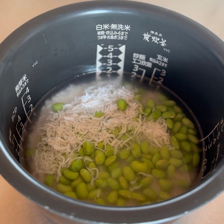 3.2に枝豆としらすを散らして入れ、通常通りに炊飯する。